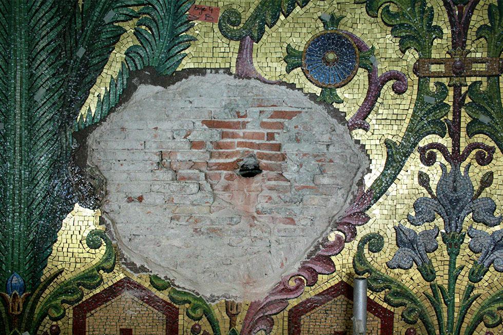 Parts of the original mosaic disappeared during the war, a plaster was used to hide the holes while waiting for the real restoration.